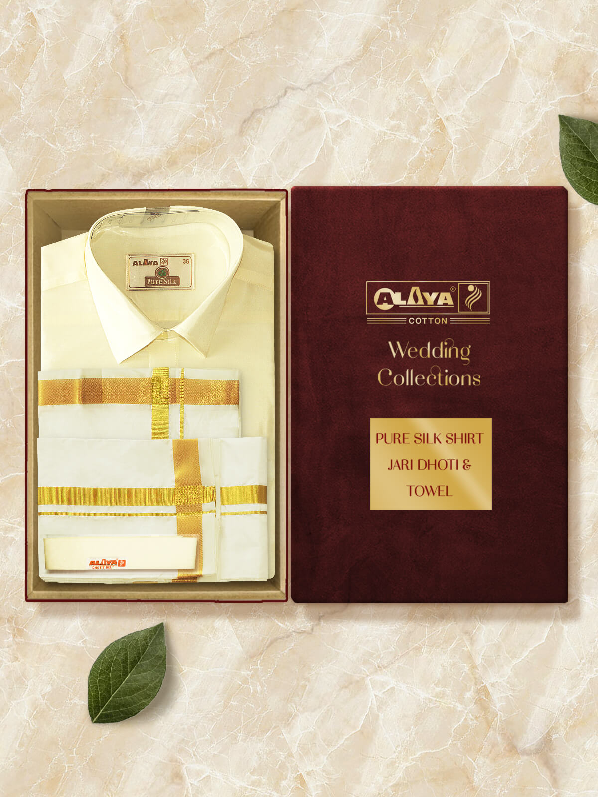 Pure Silk Dhoti, Pure Silk Shirt, Pure Silk Towel, Belt, Perfume, Velvet Box Packing.