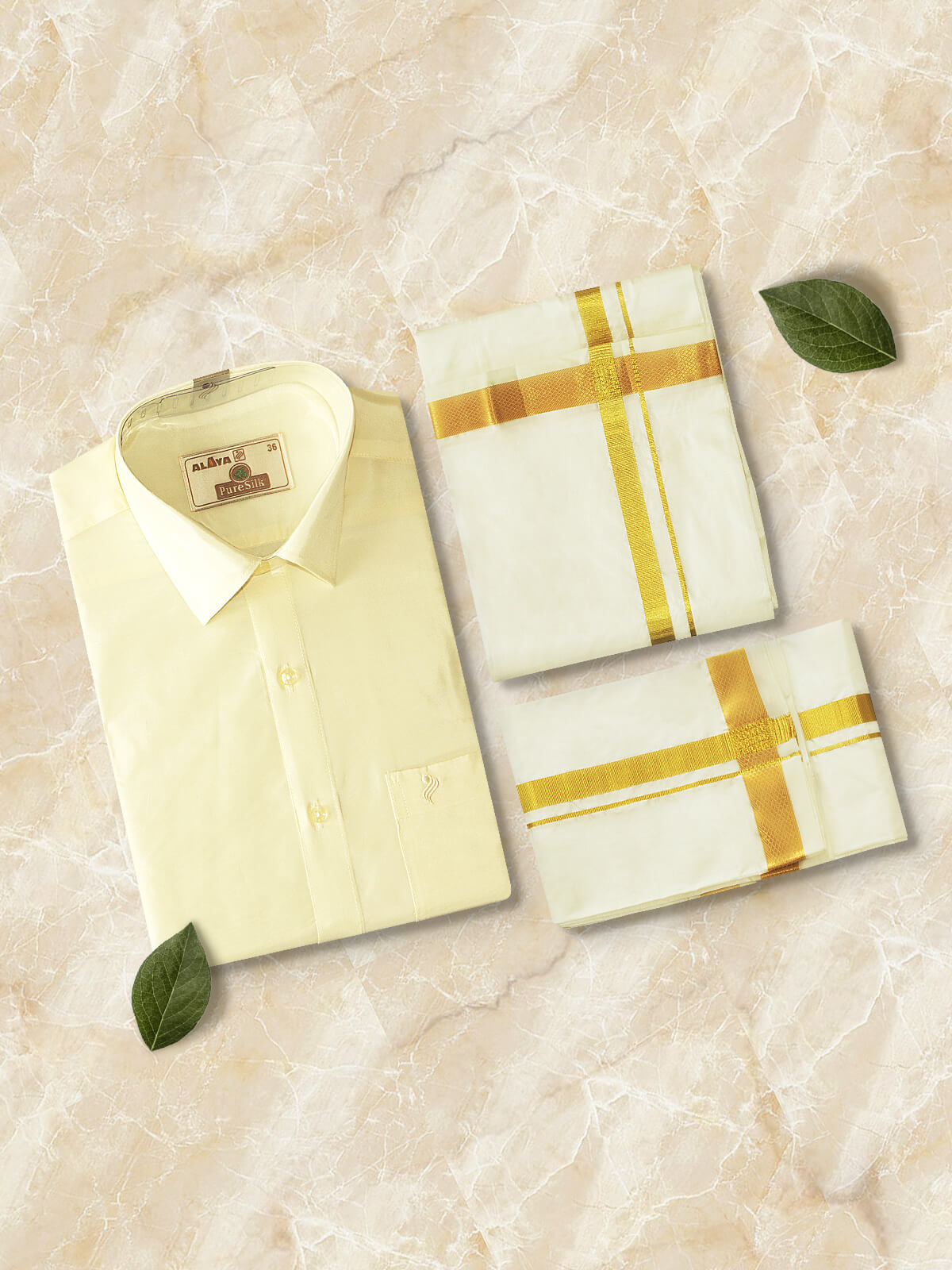 Aayush Pure Silk Cream 3 IN 1 Set - Velvet Box Packing (Pure Silks Readymade Shirt, Dhoti & Towel)