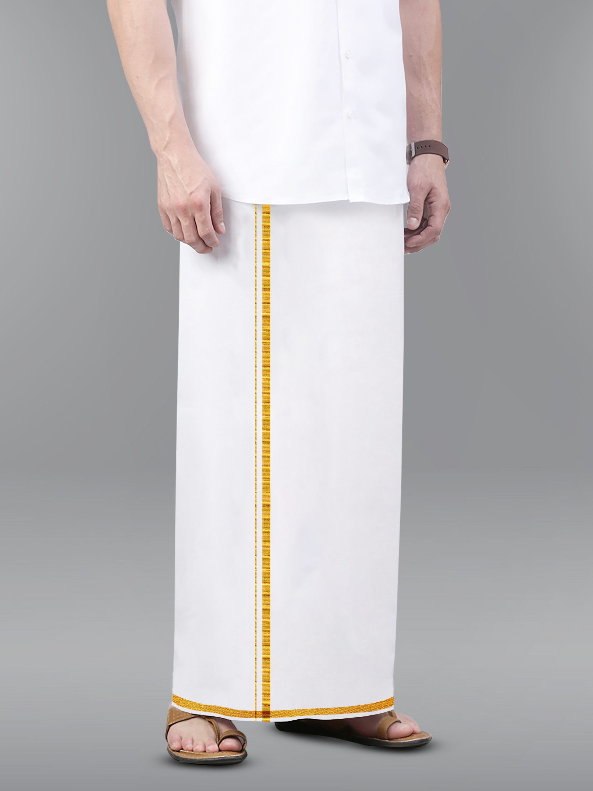 Achieve a Timeless Look with Gold Faram Jari 0.75" Border Single Dhoti 2.0 Meter. Explore the Wide Range of Gold Jari Dhoti Options.