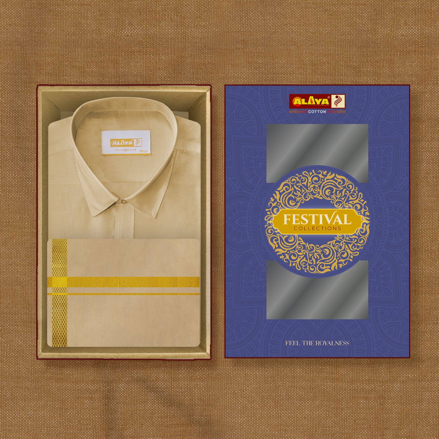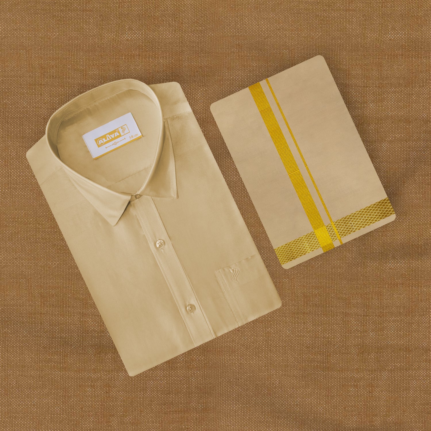 This Hasana Silk Shirt and Dhoti Set combines luxury and comfort. The Sandal-coloured outfit is perfect for weddings, thanks to the Silk fabric, full sleeve shirt, and 3.65-meter Dhoti. The shirt is designed to fit chest sizes 36 to 44. Enhance your look with this timeless set.