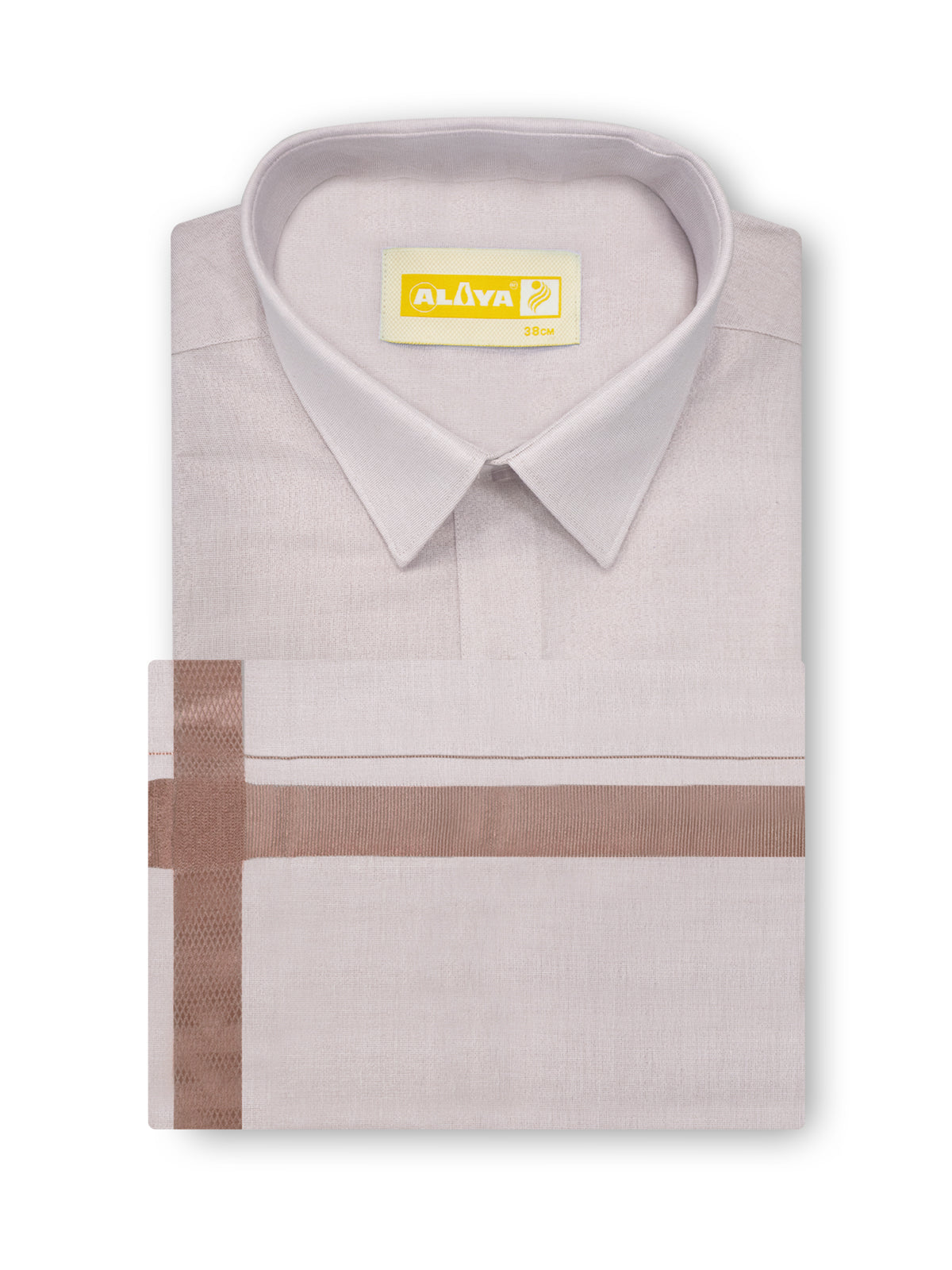 Grooms style and personality are defined by the wedding dress. Embrace your manliness with the Kondattam Grand Tissue Shirt & Dhoti Combo