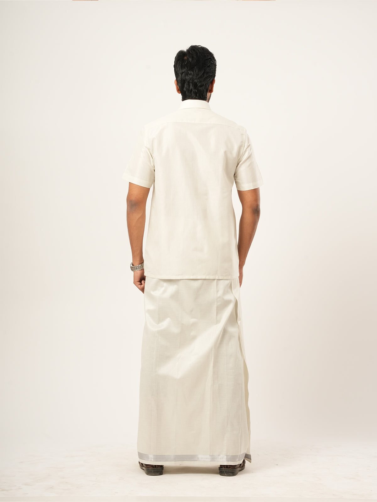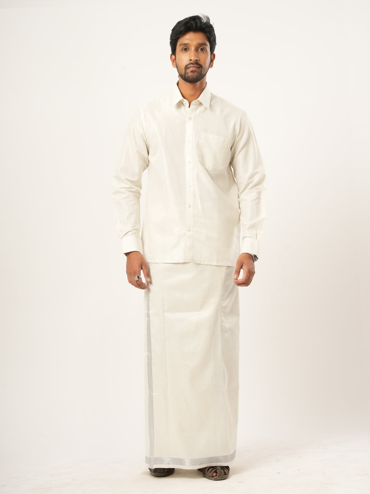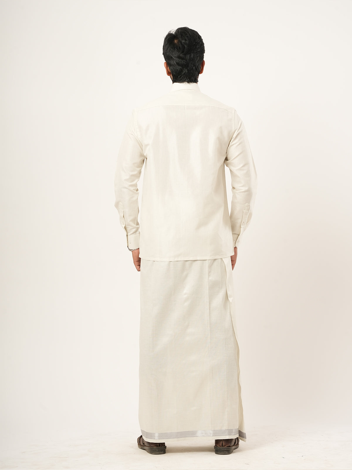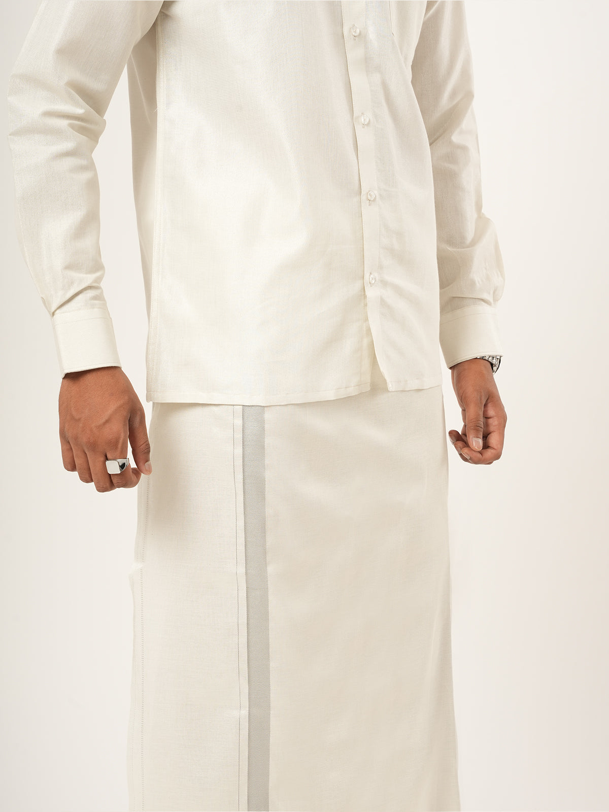 Grooms style and personality are defined by the wedding dress. Embrace your manliness with the Kondattam Tissue Shirt & Gold Border Dhoti Set