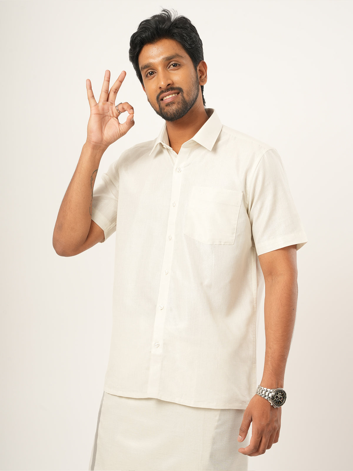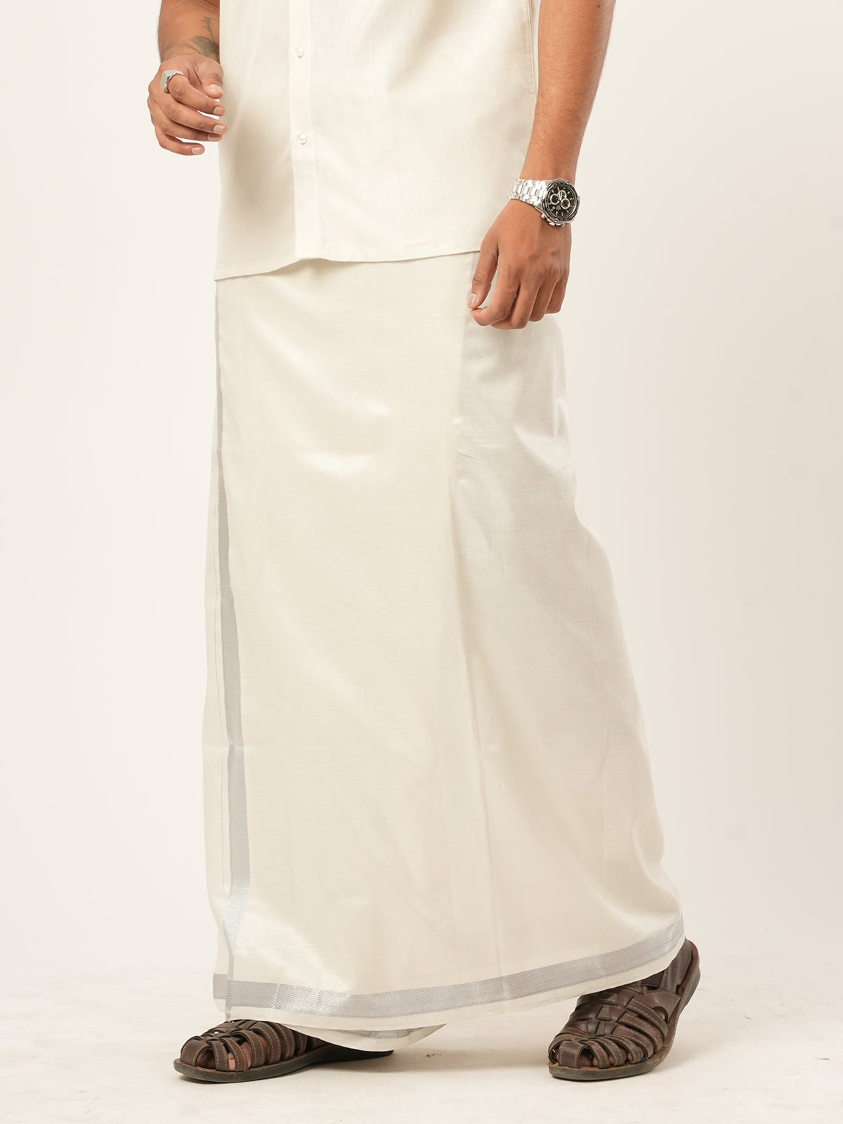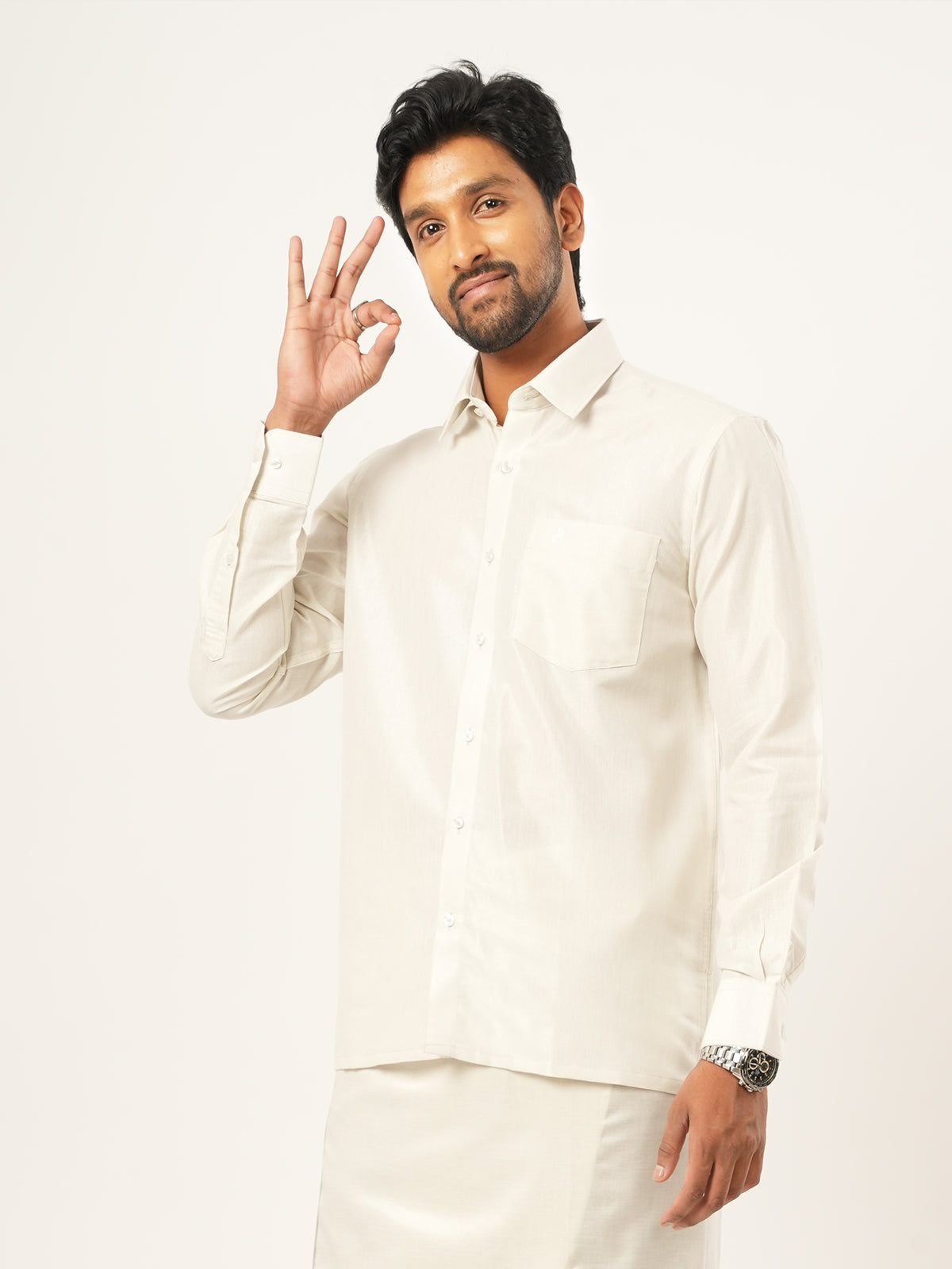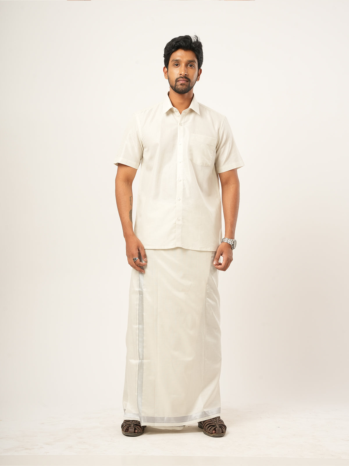 Grooms style and personality are defined by the wedding dress. Embrace your manliness with the Kondattam Tissue Shirt & Gold Border Dhoti Set