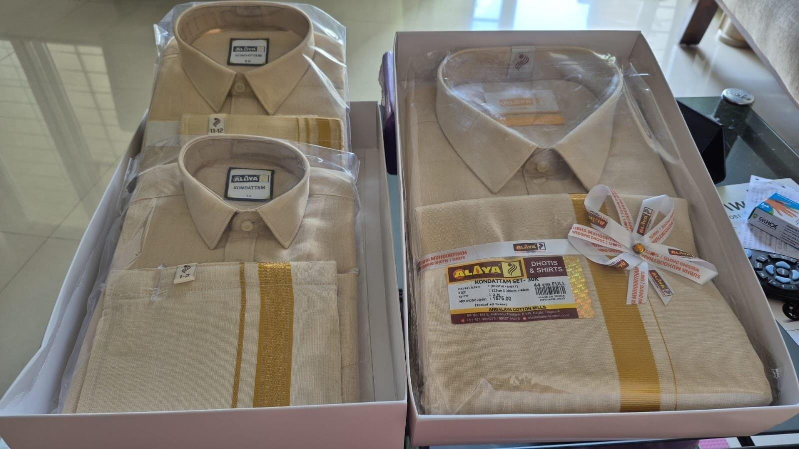 Grooms style and personality are defined by the wedding dress. Embrace your manliness with the Kondattam Tissue Shirt & Gold Border Dhoti Set