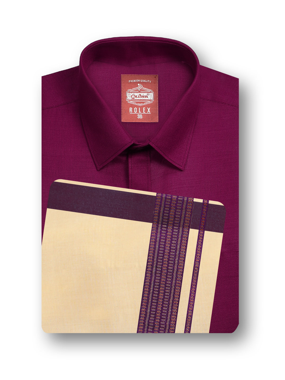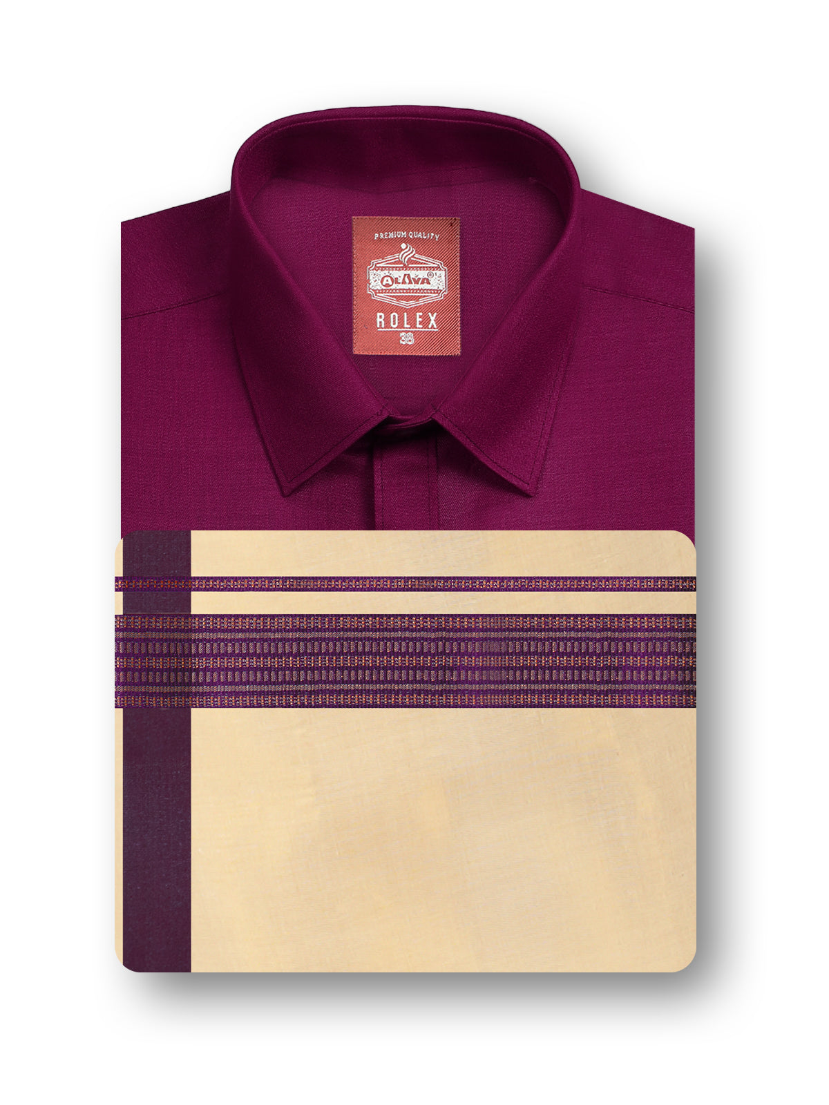 Introducing the Alaya Cotton Rolex Color Shirt and Fancy Border Tissue Single Dhoti Set - R1. This slim fit set features a solid pattern and an arrow cut hemline. Perfectly crafted with a spread collar for a sophisticated look. Elevate your style with our newly launched set.