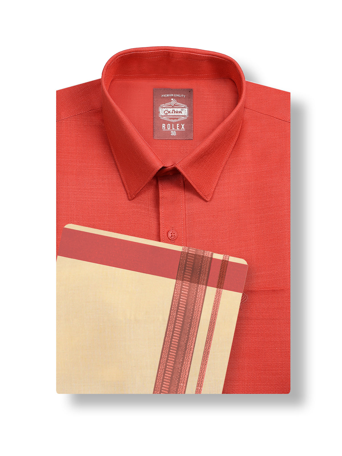 Introducing the Alaya Cotton Rolex Color Shirt and Fancy Border Tissue Single Dhoti Set - R1. This slim fit set features a solid pattern and an arrow cut hemline. Perfectly crafted with a spread collar for a sophisticated look. Elevate your style with our newly launched set.